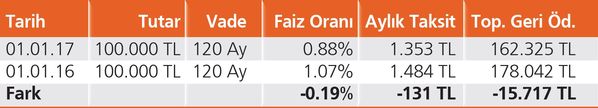 Konut kredisi faiz oranlarının son 1 yılda yüzde 1.07’lerden yüzde 0.88’lere gerilemesi, ev almak isteyen tüketicilerin kredi maliyetini yüzde 9 düşürdü. Halihazırda yüzde 0.88 oranla 10 yıl vadeli konut kredisi kullanmak mümkün. Faiz oranlarındaki düşüş nedeniyle 100 bin lira kredi çeken bir vatandaş, 1 yıl önceye kıyasla 15 bin lira daha az ödüyor. 2016 yılının ocak ayında alacağı konut için 10 yıl vadeli 100 bin lira tutarında kredi çeken bir tüketici toplamda 178 bin lira öderken, 2017 Ocak’ta rakam 162 bin liraya geriledi.