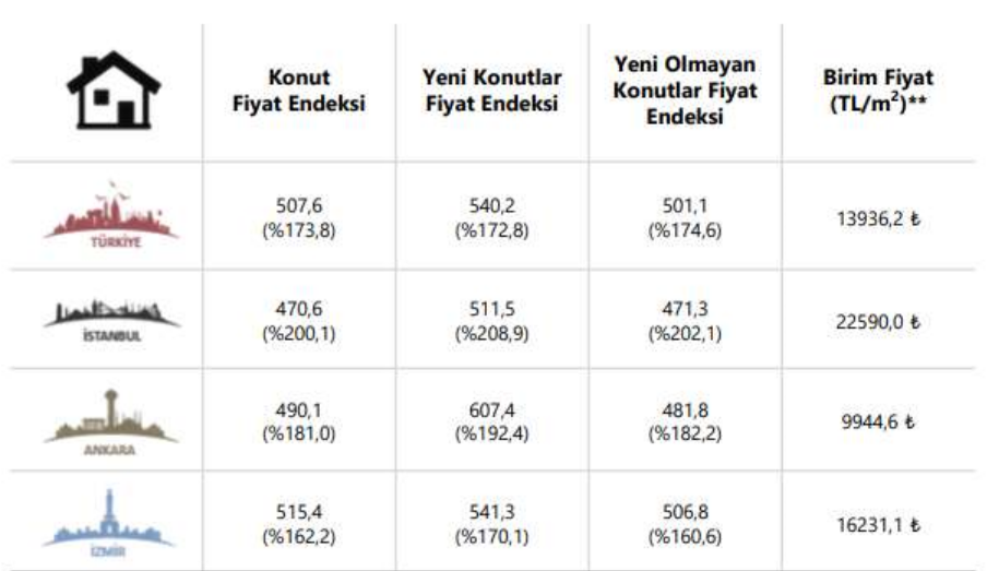 Konut fiyat endeksi temmuz ayında bir önceki aya göre yüzde 8,0, geçen yılın aynı ayına göre yüzde 173,8 artış gösterdi. Bir önceki ay yıllık artış yüzde 160,57 seviyesinde bulunuyordu.