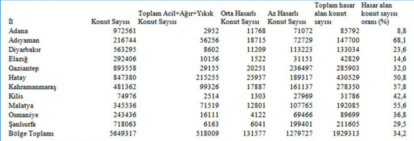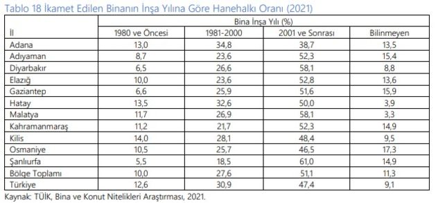 "Tablodan görüleceği üzere 1980 ve öncesi yıllarda inşa edilen binalarda yaşayan hanehalkı oranı Türkiye genelinde yüzde 12,6 iken; deprem bölgesinde yüzde 10 düzeyindedir. Bu oran bakımından Adana, Hatay ve Kilis, Türkiye ortalamasının üzerinde kalmaktadır. 1981-2000 yılları arasında inşa edilen konutlarda yaşayan hanehalkı oranı ülke geneli için yüzde 30,9 iken; 11 il ortalaması yüzde 27,6’dır. Bu dönemde inşa edilen binalarda oturan hanehalkı oranı Adana ve Hatay’da Türkiye ortalamasının üzerindedir. 2001 ve sonrasında inşa edilen binalarda ikamet eden hanehalkı oranı bakımından Türkiye ortalaması yüzde 47,4 iken; deprem bölgesi ortalaması yüzde 51,1’dir. Bu kategoride Adana, Hatay, Kilis ve Osmaniye, Türkiye ortalamasının altında kalmaktadır. Adana, Hatay ve Kilis’te yapı stokunun nispeten daha eski olduğu anlaşılmaktadır."