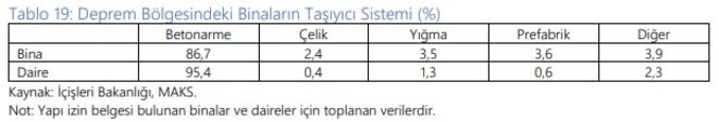 "Deprem bölgesindeki binaların yüzde 86,7’si, dairelerin ise yüzde 95,4’ü betonarmedir. Binaların yüzde 2,4’ü çelik, yüzde 3,5’i yığma, yüzde 3,6’sı prefabriktir. Diğer kategorisinde ahşap, karma veya tanımlanamayan taşıyıcı sistemler yer almakta olup diğer taşıyıcı sistemlerin payı oldukça düşüktür. Deprem dirençliliği açısından en problemli kategori olan yığma yapıların düzeyi düşük kalmaktadır. Diğer yandan, maliyeti yüksek olmakla birlikte depremlere karşı dayanıklı olduğu genellikle kabul edilen çelik konstrüksiyon yapıların da oldukça düşük oranda olduğu görülmektedir. Depreme maruz kalan illerdeki yapı stokunun büyük oranda betonarme olması verisinin yorumlanabilmesi, hasarlı binaların taşıyıcı sistemi konusunda daha detaylı bilgi edinilmesiyle mümkün olabilecektir. Ayrıca, yapı izni olmayan binalar için de veri toplanması gerekmektedir. Yapı izni olmayan binalar proje ve yapım aşamasında herhangi bir kontrol ve denetime tabi tutulmadığından daha yüksek risk taşımaktadır." (Habertürk-Ahmet Hamdi Girgin)