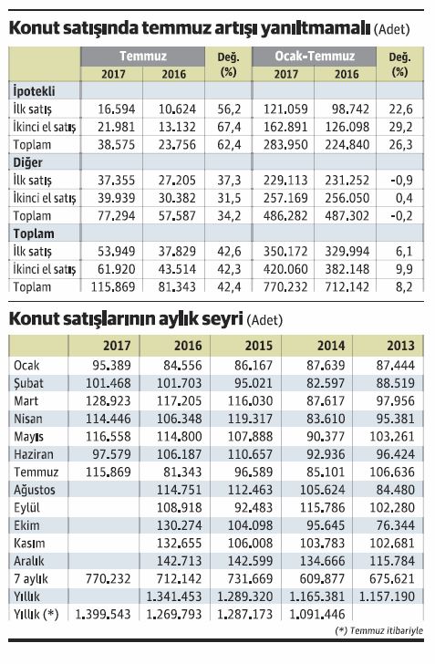 Türkiye İstatistik Kurumu ile Tapu ve Kadastro Genel Müdürlüğü'nün ortaklaşa oluşturduğu veriler, ilk bakışta konut satışlarının temmuzda müthiş bir ivme kazandığını gösteriyor. Öyle ya, konut satışlarının temmuzda geçen yıla göre yüzde 42 artması olağanüstü bir gelişme çünkü.