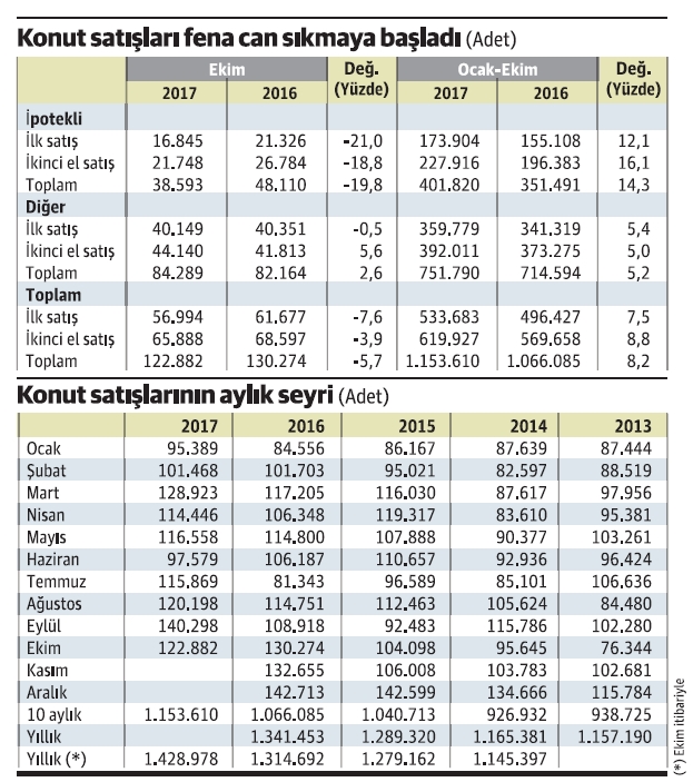 Konut satışları eylül ayında 140 bin adetle bu yılın rekorunu kırdığında bu düzeye ulaşılma nedeni belliydi. Tapu harçlarındaki indirim eylül ayında bitecekti ve konut almak isteyenler de ekim ayına kalmamak için alımlarını bir anlamda öne çekmişlerdi.
