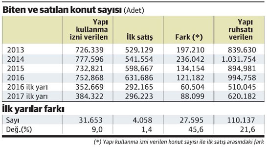 Yapı ruhsatı verilen konut sayısın 110 bin, yapı kullanma izni verilen, yani kullanıma arz edilen yeni konut sayısının 32 bin arttığı bir dönemde, konuttaki ilk satış artışı yalnızca 4 binde kaldı.