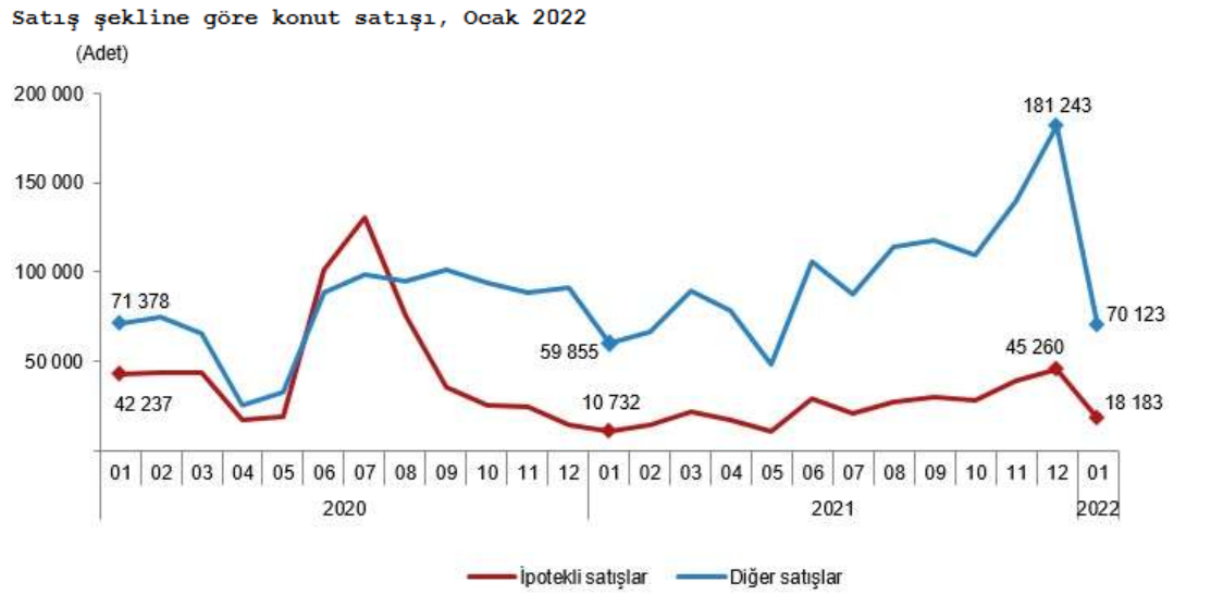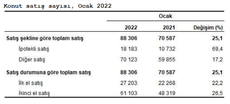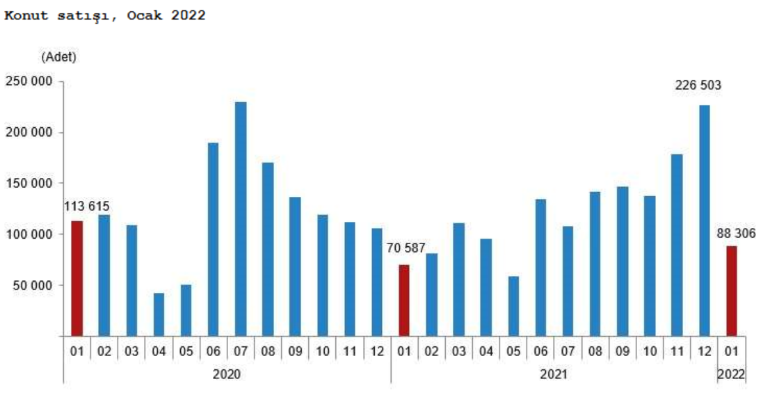 Türkiye genelinde konut satışları Ocak ayında bir önceki yılın aynı ayına göre %25,1 artarak 88 bin 306 oldu. Konut satışlarında İstanbul 15 bin 110 konut satışı ve %17,1 ile en yüksek paya sahip oldu. Satış sayılarına göre İstanbul'u 8 bin 255 konut satışı ve %9,3 pay ile Ankara, 5 bin 486 konut satışı ve %6,2 pay ile İzmir izledi. Konut satış sayısının en az olduğu iller sırasıyla 18 konut ile Ardahan, 31 konut ile Hakkari ve 44 konut ile Bayburt oldu.