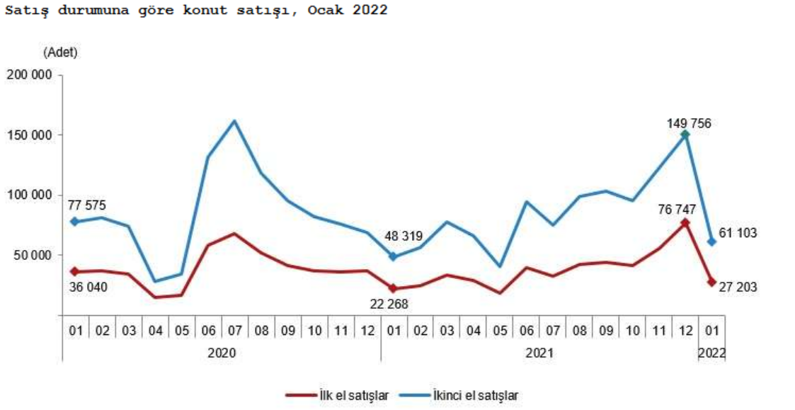Türkiye genelinde ilk el konut satış sayısı, Ocak ayında bir önceki yılın aynı ayına göre %22,2 artarak 27 bin 203 oldu. Toplam konut satışları içinde ilk el konut satışının payı %30,8 oldu.