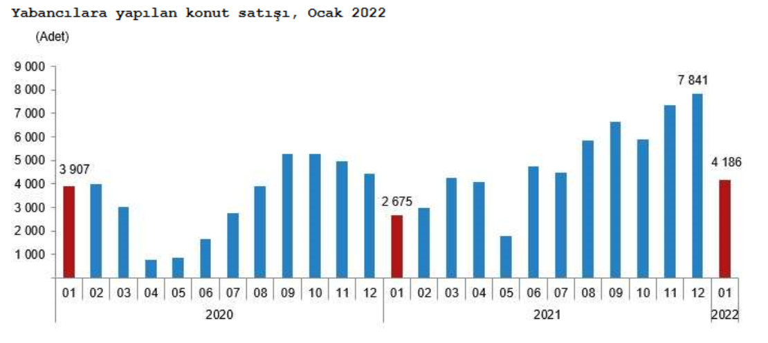 Yabancılara yapılan konut satışları Ocak ayında bir önceki yılın aynı ayına göre %56,5 artarak 4 bin 186 oldu. Ocak ayında toplam konut satışları içinde yabancılara yapılan konut satışının payı %4,7 oldu. Yabancılara yapılan konut satışlarında ilk sırayı bin 771 konut satışı ile İstanbul aldı. İstanbul'u sırasıyla 914 konut satışı ile Antalya, 269 konut satışı ile Ankara izledi.