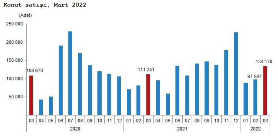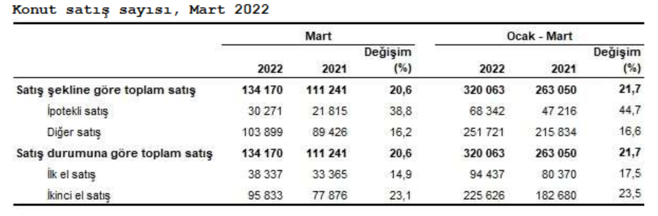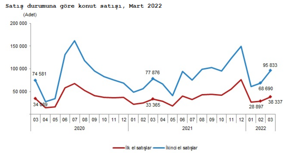 Türkiye genelinde ikinci el konut satışları Mart ayında bir önceki yılın aynı ayına göre %23,1 artış göstererek 95 bin 833 oldu. Toplam konut satışları içinde ikinci el konut satışının payı %71,4 oldu. İkinci el konut satışları Ocak-Mart döneminde ise bir önceki yılın aynı dönemine göre %23,5 artışla 225 bin 626 olarak gerçekleşti.