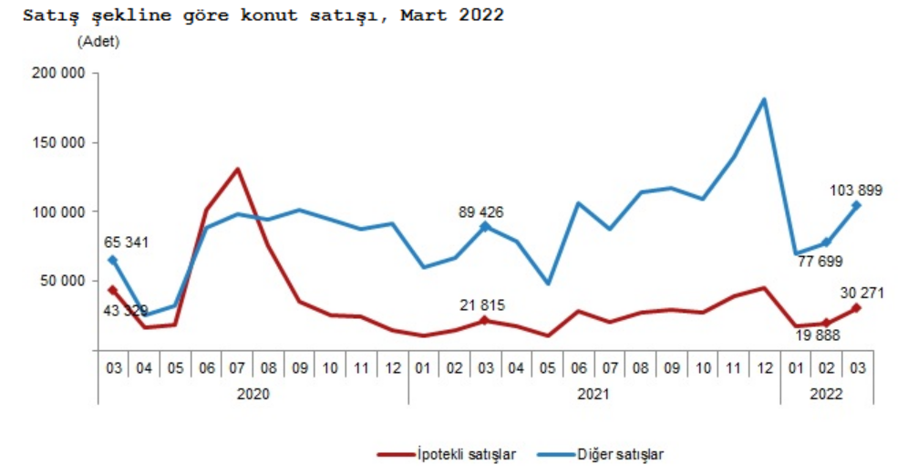 Türkiye genelinde diğer konut satışları Mart ayında bir önceki yılın aynı ayına göre %16,2 artarak 103 bin 899 oldu. Toplam konut satışları içinde diğer satışların payı %77,4 olarak gerçekleşti. Ocak-Mart döneminde gerçekleşen diğer konut satışları ise bir önceki yılın aynı dönemine göre %16,6 artışla 251 bin 721 oldu.