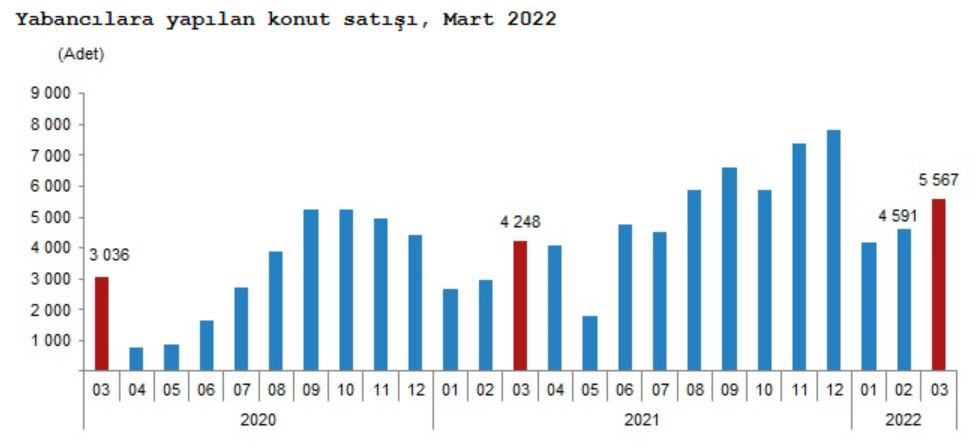 Yabancılara yapılan konut satışları Mart ayında bir önceki yılın aynı ayına göre %31,0 artarak 5 bin 567 oldu. Mart ayında toplam konut satışları içinde yabancılara yapılan konut satışının payı %4,1 oldu. Yabancılara yapılan konut satışlarında ilk sırayı 2 bin 245 konut satışı ile İstanbul aldı. İstanbul'u sırasıyla bin 434 konut satışı ile Antalya, 347 konut satışı ile Ankara izledi.
