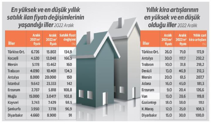Satılık konut fiyatlarındaki yıllık artış oranı Türkiye genelinde düştü. Kasımda yüzde 174,1 olan yıllık fiyat artışı aralık ayında yüzde 134,9’a geriledi. Geçen yılın aynı ayında 6.726 TL olan Türkiye geneli ortalama satılık konut ilan m2 fiyatı 15.802 TL’ye yükseldi. Satılık konut cari fiyatlarındaki yıllık artış oranı; İstanbul’da yüzde 190,5’ten yüzde 142’ye, Ankara’da yüzde 181,7’den yüze 139,6’ya, İzmir’de ise 169,1’den yüzde 136,9’a geriledi. Üç büyük ildeki düşüşe büyükşehirlerdeki fiyatlar da eşlik etti. En düşük artışların görüldüğü iller sırasıyla Erzurum (yüzde 108,8), Muğla (yüzde 102,8), Kayseri (yüzde 98,5), Şanlıurfa (yüzde 96,9) ve Diyarbakır (yüzde 91 olurken, yıllık fiyat artışının yaşandığı büyükşehirler sırasıyla; Kocaeli (yüzde 166,5), Mersin (yüzde 160), Trabzon (yüzde 154,3), Antalya (yüzde 150) ve İstanbul (yüzde 142) oldu.