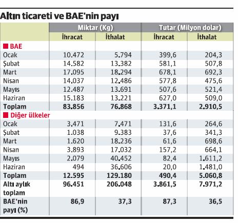 Tutarlar ortada... İlk altı ayda Birleşik Arap Emirlikleri'ne 3.4 milyar dolarlık altın ihraç edip bu ülkeden 2.9 milyar dolarlık da ithalat gerçekleştirmişiz.