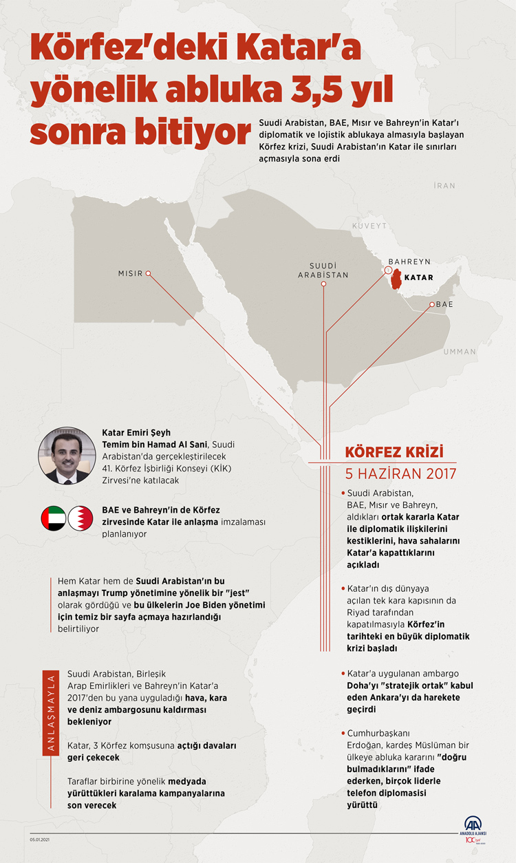 Suudi Arabistan, Birleşik Arap Emirlikleri (BAE), Mısır ve Bahreyn'in sürpriz niteliğinde bir adımla, Katar ile tüm diplomatik ilişkilerini dondurması, kara ve hava tüm sahalarını Doha'ya kapatmalarıyla başlayan "Körfez krizi"nin, 3,5 yılın ardından bugünkü KİK zirvesiyle resmi olarak sona ereceği ifade ediliyor.
