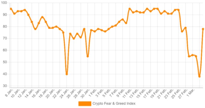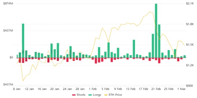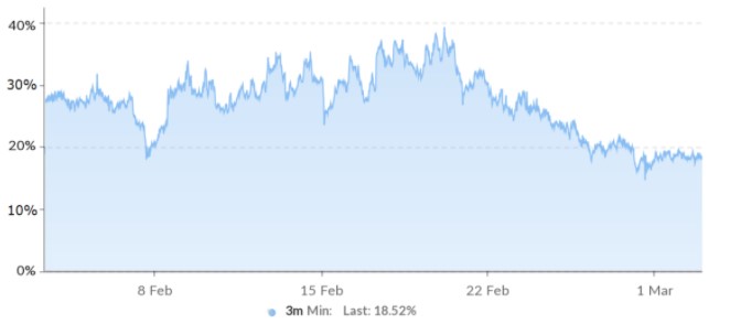 19 Şubat'tan 23 Şubat'a kadar, toplam açık pozisyon miktarının yüzde 28'ine denk gelen uzun vadeli sözleşmeler ile 2 milyar dolarlık tasfiye görüldü. Bu nedenle, önceki Korku ve Hırs göstergesinde belirtildiği gibi, piyasa duyarlılığında önemli bir bozulma beklenebilir. Fakat Ether türev piyasalarında bunların hiçbiri henüz gerçekleşmedi, hem vadeli işlem sözleşmeleri primi (contango) hem de opsiyon eğrileri yükselmeye devam etti.