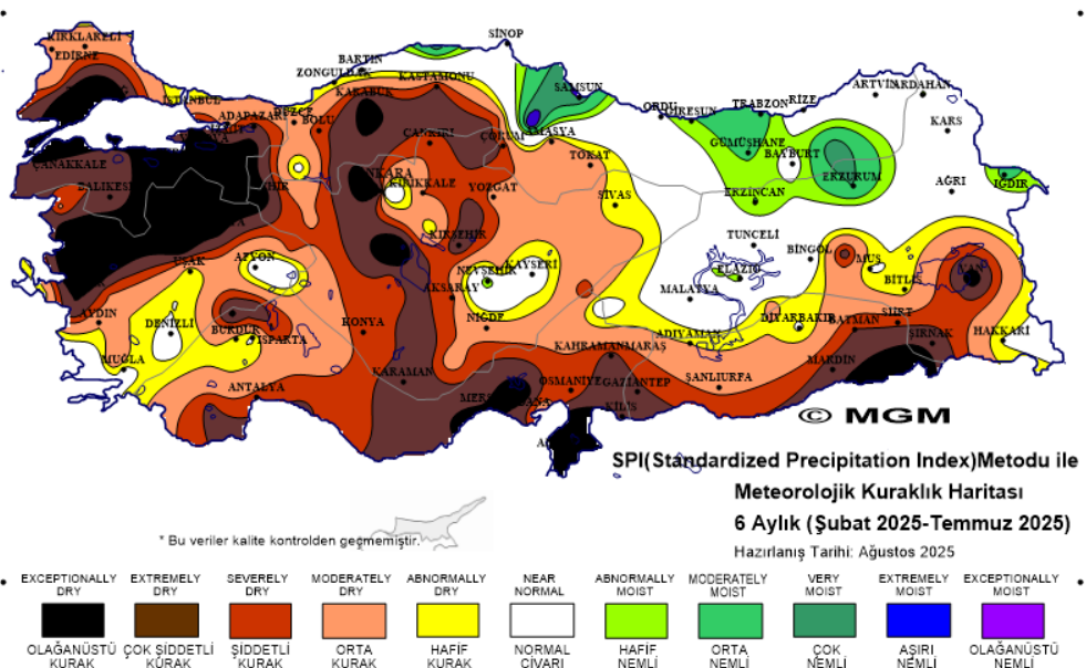 Türkiye'nin birçok bölgesi "kuraklık" alarmı veriyor. Meteoroloji'nin 2025'e ait haritasında "olağanüstü" ve şiddetli" kuraklık yaşanan bölgelerin sayısının arttığı görüldü. Uzmanlar ciddi seviyeye ulaşan durumun etkilerinin geniş kapsamlı olacağını söyleyerek acil önlem istedi.