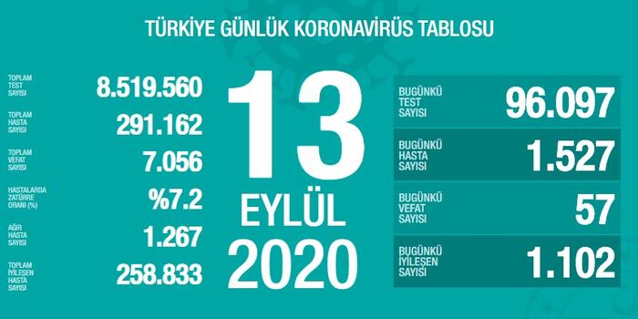 Sağlık Bakanı Fahrettin Koca, 13 Eylül günü itibari ile son 24 saatte gerçekleşen korona virüsle ilgili ölüm ve toplam vaka sayısını paylaştı. Türkiye'de son 24 saatte 96 bin 97 Kovid-19 testi yapıldı, bin 527 kişiye hastalık tanısı konuldu. Son 24 saatte 57 kişi Kovid-19 nedeniyle hayatını kaybetti, ağır hasta sayısı bin 267 oldu.