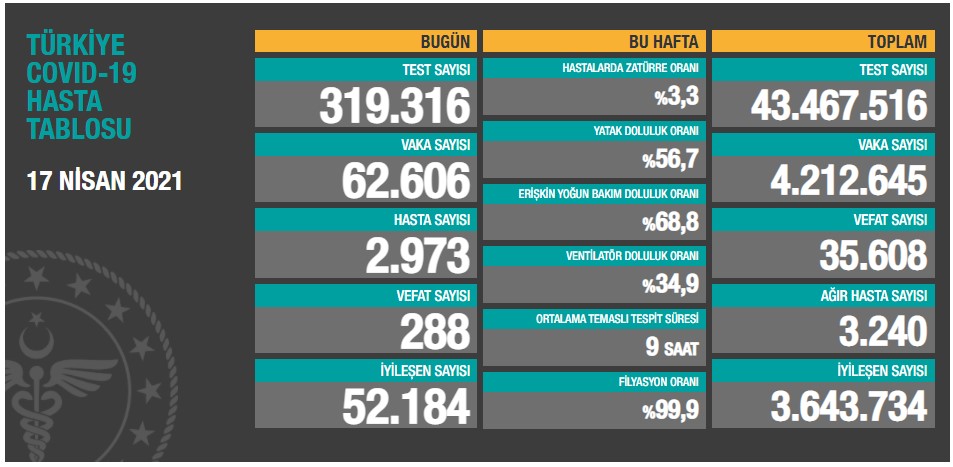 Sağlık Bakanlığı tarafından paylaşılan 17 Nisan 2021 korona virüs tablosunda Türkiye'de son 24 saatte 319 bin 316 Kovid-19 testi yapıldı, 62 bin 606 kişinin testi pozitif çıktı, 288 kişi hayatını kaybetti. Ağır hasta 3 bin 240 oldu, 52 bin 184 kişinin Kovid-19 tedavisinin/karantinasının sona ermesiyle iyileşen sayısı 3 milyon 643 bin 734'e yükseldi.