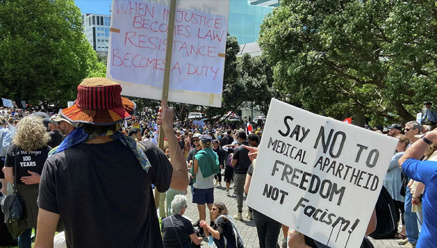 Wellington'ın merkezinden yürüyüşe geçen çoğu maskesiz protestocu, 'Özgürlük' yazılı pankartlar parlamento binasının önünde toplandı. Parlamentonun iki girişi kapatılırken, medyanın 'sahte' ve 'yalancı' olarak nitelendirildiği pankartlar da dikkat çekti. Protestocular, hükümetten zorunlu aşılamayı ve kısıtlamaları kaldırmasını talep ederek slogan attı.