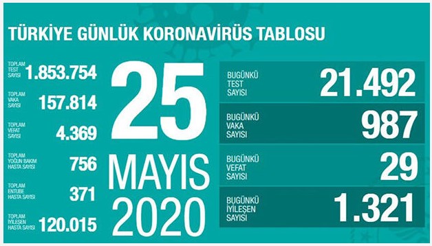 Sağlık Bakanı Fahrettin Koca Türkiye Günlük Koronavirüs Tablosu'nu paylaştı. Tabloya göre, son 24 saatte 987 kişiye Kovid-19 tanısı konuldu, 29 kişi hayatını kaybetti, toplam vaka sayısı 157 bin 814, can kaybı 4 bin 369 oldu.