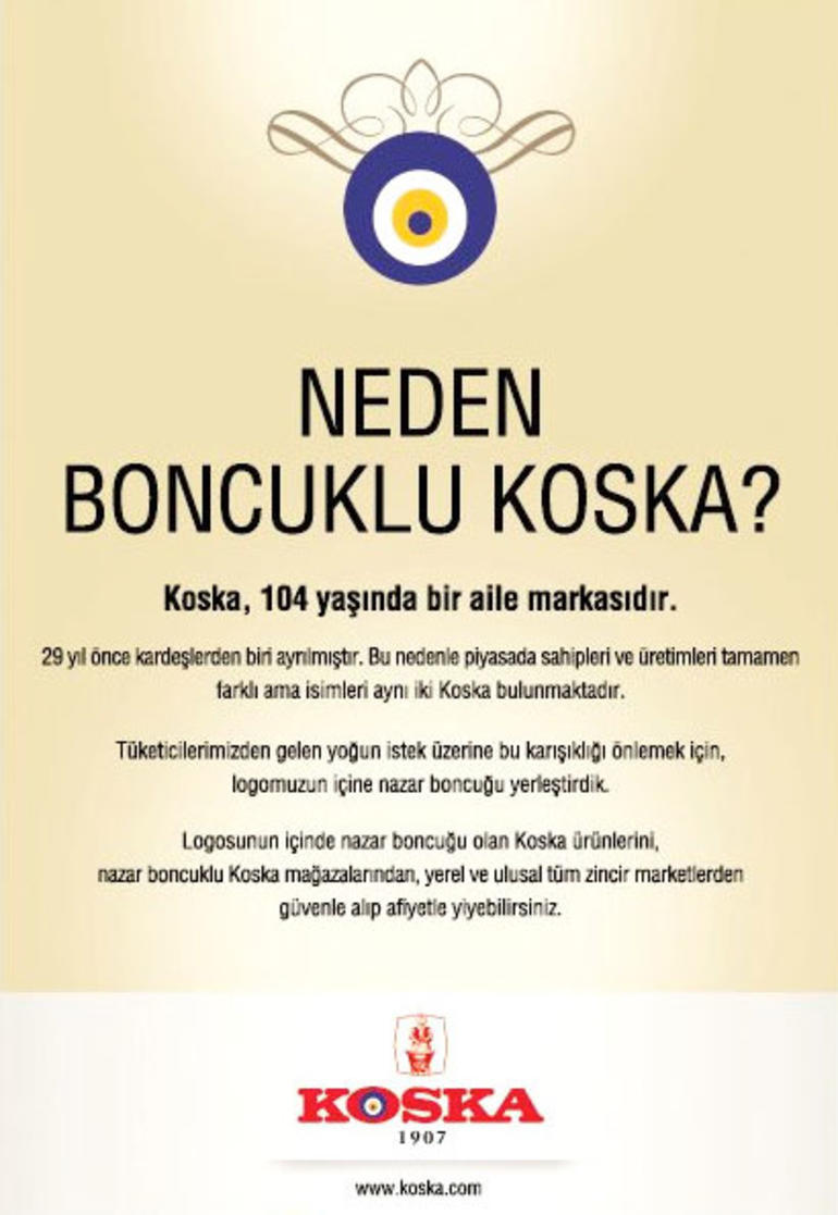 Ortak kullandıkları ‘Koska’ markasının logosuna nazar boncuğu ekleyen Nevzat Dindar’ın, verdiği karşı ilanla marka hakkına tecavüz ve haksız rekabetle suçladığı kardeşi Mahir Dindar’a 6 yıl önce açtığı dava, gazetede yayımlanma kararı verilen ilanın ölçüsü belirtilmeyince Yargıtay tarafından bozuldu. Hürriyet'ten Özge Eğrikar'ın haberine göre, mahkeme yeniden görülen davada, ilanın 20 santime 30 santim olarak yayınlanmasına karar verdi.