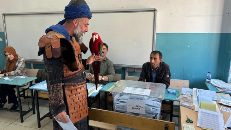 İstanbul Esenyurt'ta, oy vermeye "Onsuz yaşayamam" dediği Ara cinsi papağanı Paşa ile gelen Nazım Cihan, yoğun ilgi gördü.