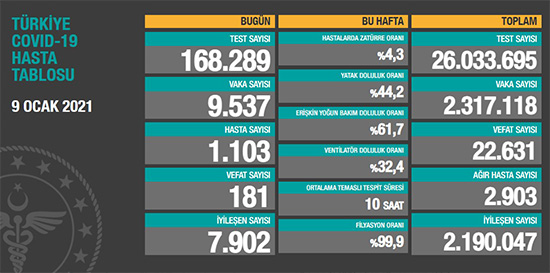 Sağlık Bakanı Fahrettin Koca korona virüs vakalarıyla ilgili son durumu açıkladı. Türkiye'de son 24 saatte 168 bin 289 Kovid-19 testi yapıldı, 9 bin 537 kişinin testi pozitif çıktı, 181 kişi hayatını kaybetti. Ağır hasta 2 bin 903 oldu, 7 bin 902 kişinin Kovid-19 tedavisinin/karantinasının sona ermesiyle iyileşen sayısı 2 milyon 190 bin 47'ye yükseldi. Bakan Koca yaptığı değerlendirmede, "Ağır hasta sayısı 3.000’in altına geriledi. Kısıtlama ve tedbirler netice veriyor." dedi.