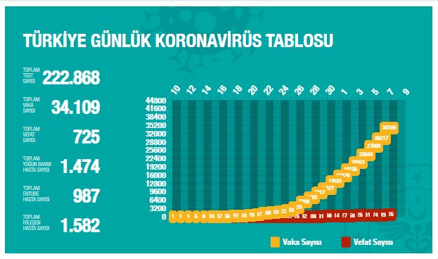 Türkiye'de ise 34 bin 109 vaka bulunurken, toplam can kaybı 725 oldu. İyileşen hasta sayısı bin 500'Ü aşarken, vakaların bin 474'ü yoğun bakımda bulunuyor.