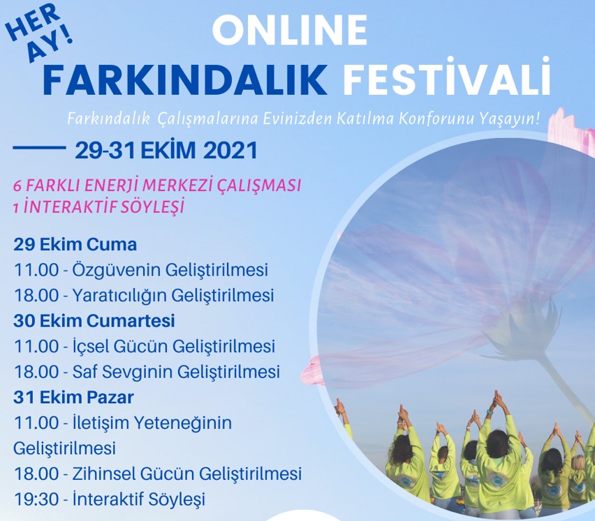 Dünya Değişim Akademisi tarafından her ay kesintisiz olarak gerçekleştirilen Online Farkındalık Festivali’nde, bağışıklık sistemini güçlendiren, virüse karşı dayanıklılığı artıran, oluşan stres ve gerilimi ortadan kaldırıp, moral ve motivasyonu yükselten 6 temel enerji merkezi çalışması yer alıyor. Festivale Türkiye’nin ve dünyanın her yerinden online olarak katılım mümkün.