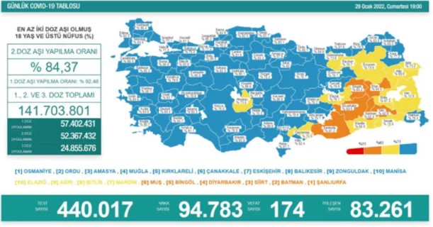 Sağlık Bakanlığı tarafından 29 Ocak 2022 korona virüs tablosu paylaşıldı.