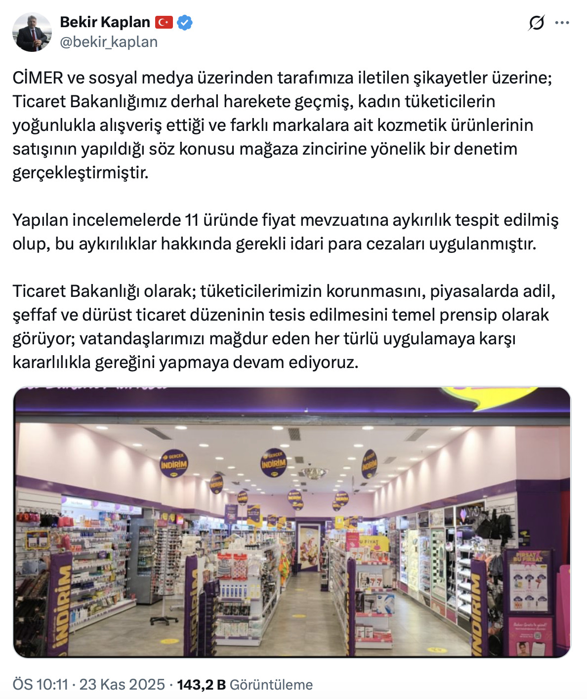 Türkiye genelinde çok sayıda şubesi bulunan büyük bir kozmetik mağaza zinciri, Ticaret Bakanlığı tarafından denetlendi. Vatandaşların CİMER ve sosyal medya platformları üzerinden ilettiği yoğun şikayetler üzerine harekete geçen Bakanlık ekipleri, denetimler sonucunda 11 üründe fiyat mevzuatına aykırılık belirledi. Tespit edilen bu aykırılıklar nedeniyle ilgili işletmeye idari para cezası uygulandı.