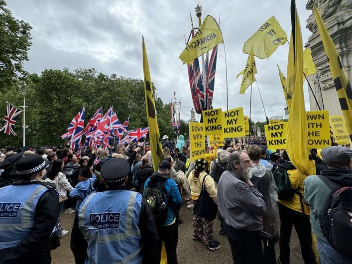Buckingham Sarayı'nın çıkışındaki Victoria anıtının karşısında toplanan Republic grubu üyeleri, kortejin geçişi sırasında "Benim kralım değil", "Tacınla birlikte devril", ve "Monarşiyi kaldır" yazılı pankartlar ve bayraklarla monarşiye tepki gösterdi.