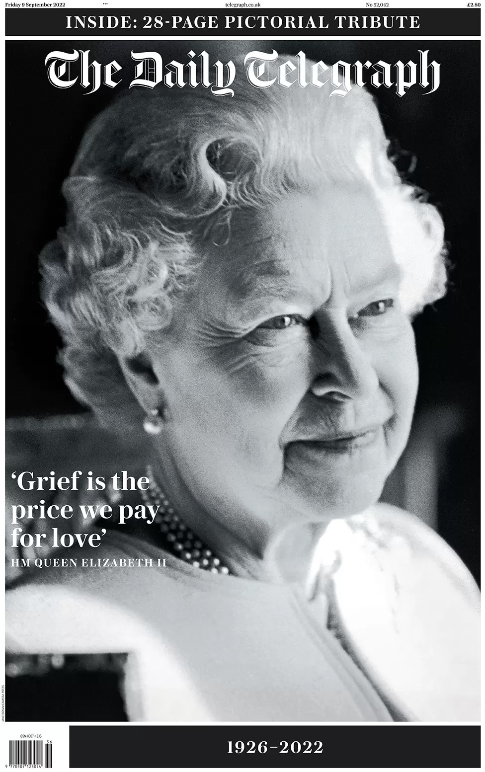 Daily Telegraph gazetesi ise manşetinde Kraliçe'nin fotoğrafının yanına, onun 11 Eylül saldırılarının ardından, hayatını kaybedenlerin yakınlarına hitaben söylediği bir sözü yazdı: "Yas, sevgimiz için ödediğimiz bedeldir". ABD Başkanı Joe Biden de bugünkü anma konuşmasında aynı alıntıdan bahsetmiş ve 11 Eylül saldırılarının ardından Kraliçe'nin gösterdiği dayanışmayı anlatmıştı.