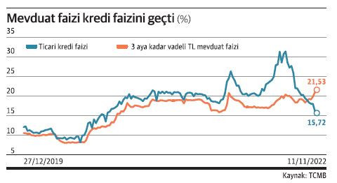Merkez Bankası verilerine göre ticari kredi kartı ve KMH hariç ticari kredi faizi ile 3 aya kadar vadeli TL mevduat faizi arasındaki fark 18 Ekim’de yapılan düzenleme sonrası belirginleşti. 14 Ekim ile biten haftada fark 0.94 puan iken 21 Ekim’de 1.12, 28 Ekim’de 1.85, 4 Kasım haftasında ise 4.72 puana kadar yükseldi, mevduat faizi yüzde 20’yi aştı. Politika faizi yüzde 10,5’e düşürüldüğü ekim PPK toplantısı sonrasında ticari kredi faizi gerilemesini sürdürürken TL mevduat faizi yükselişini ivmelendirdi. Böylece 11 Kasım haftasında TL ticari kredi faizi yüzde 15,72’e gerilerken mevduat faizi ise yüzde 21,53’e çıktı. Aradaki fark ise 5.81 puan ile son 10 yılın en yüksek seviyesine çıktı.