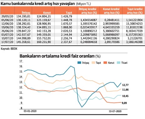 BDDK verilerine göre kamu bankalarında 17 Temmuz haftasında ihtiyaç kredileri 145.3 milyar liraya yükseldi. Ancak artış hızında yavaşlama var. 3 Temmuz haftasında haftalık artış hızı yüzde 2,2 iken 10 Temmuz haftasında yüzde 1,44'e indi. 17 Temmuz haftasında ise artış hızı yüzde 0,2'ye kadar inerek neredeyse yatay kaldı. Taşıt kredilerinde de durum aynı. 3 Temmuz haftasında haftalık artış hızı yüzde 5,0 iken, 10 Temmuz haftasında yüzde 4,3'e geriledi. 17 Temmuz haftasında ise yüzde 3,5'e indi. 17 Temmuz haftasında taşıt kredisi miktarı 2.3 milyar lira oldu.
