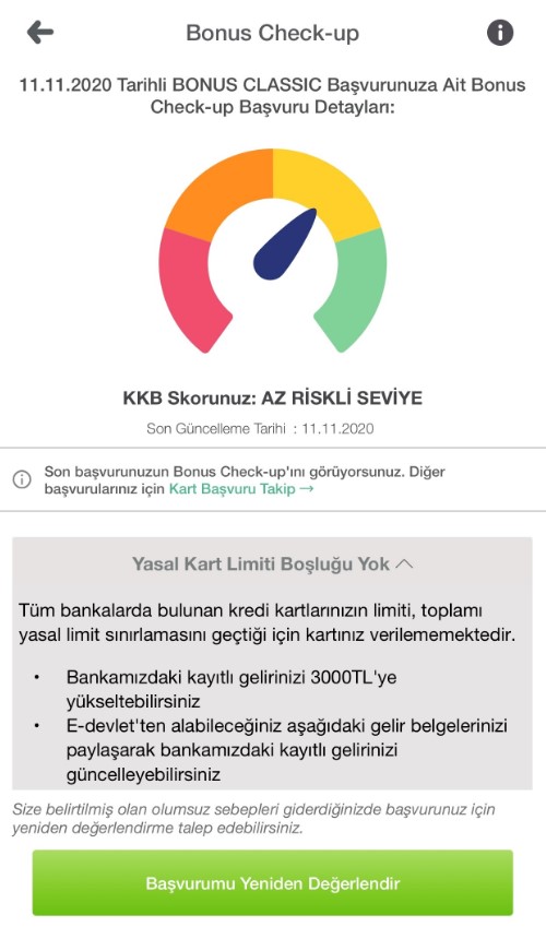 Garanti BBVA’nın Türkiye’de en çok sevilen ve yenilikçi kredi kartı Bonus, kart başvurusu olumlu sonuçlanmayan müşterilerini finansal açıdan bilgilendirmek ve yönlendirmek amacıyla Bonus Check-up uygulamasını hizmete sundu. Türkiye’de bir ilk olan Bonus Check-up kullanıcılara kredi kartı başvuru süreciyle ilgili tavsiyeler verip eksiklikler konusunda yol göstererek finansal anlamda danışmanlık hizmeti sunmayı hedefliyor. Garanti BBVA müşterileri bundan böyle, kredi kartı başvuruları olumlu sonuçlanmadığı durumda, BonusFlaş uygulaması üzerinden Bonus Check-up hizmetini kullanarak, başvurularının tekrar değerlendirilmesi için alabilecekleri kişiye özel aksiyonları açık ve net bir şekilde öğrenecekler. Başvurularının hangi finansal sebeple kabul edilmediğini veya başvuru için gerekli bilgilerin tam ve güncel olup olmadığını BonusFlaş üzerinden kolayca görüntüleyip eksiklerini tamamlayarak tekrar başvuruda bulunabilecekler.