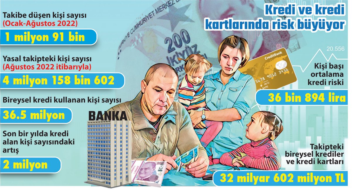 Yüksek enflasyon nedeniyle satın alma gücünde yaşanan dramatik düşüş milyonlarca vatandaşı daha fazla borçlanmaya itiyor. En temel harcamaların bile kredi kartları, krediler ve ek hesaplarla karşılanması banka borçlarında ciddi bir artışa yol açtı. Türkiye Bankalar Birliği (TBB) Risk Merkezi verilerine göre Ocak-Ağustos 2022 döneminde bireysel kredi veya bireysel kredi kartı borcundan dolayı yasal takibe intikal etmiş kişi sayısı 1 milyon 91 bin kişi oldu. Yasal takip işlemlerinde en sert artışın ise kredi kartlarında yaşandığı gözlendi. Bireysel kredi kartı borcundan dolayı yasal takibe intikal etmiş kişi sayısı 613 bin oldu. 2021 yılının Ocak-Ağustos döneminde bu sayı 310 bin kişi idi.