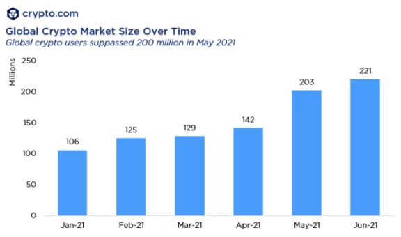 Cointelegraph Türkiye ile paylaşılan araştırmaya göre dünya genelinde kripto kullanıcısı sayısı, Haziran 2021'e kadar geçen dört aya iki kat yükseldi ve 100 milyon civarından 221 milyona çıktı. Küresel kripto kullanıcı sayısı, Mayıs 2020-Şubat 2021 arasında ise 65 milyondan 100 milyona çıkmıştı.