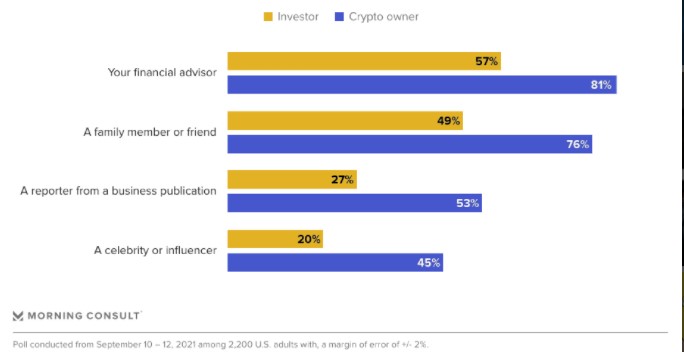 Buna göre ankete katılan kripto para sahiplerinin yüzde 45'i, ünlü isimler veya sosyal medya fenomenlerinden aldıkları kripto para yorumlarına güvendiklerini söyledi.
