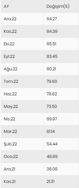 Yİ-ÜFE (2003=100) 2022 yılı Aralık ayında bir önceki aya göre %0,24 azalış; bir önceki yılın Aralık ayına göre %97,72 , bir önceki yılın aynı ayına göre %97,72 ve on iki aylık ortalamalara göre %128,47 artış gösterdi.