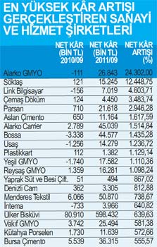 Net kâr artışı en yüksek şirketlere bakıldığında gayrimenkul şirketlerine ilginin sürdüğü gözleniyor. Alarko GMYO 2010 yılında 111 milyon TL zararda iken bu yılın 9 aylık döneminde 26 milyon TL kâra geçti. Şirketin kârlılığındaki artışın nedeni portföyünde bulunan nitelikli gayrimenkullerden elde ettiği istikrarlı kira gelirlerinin artarak devam etmesi.