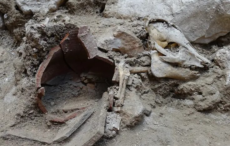 Dr. Uziel “Doğu yamaçlarını kazarken ‘İlk Tapınak’ dönemi diye bilinen Demir Çağı'nın ikinci yarısından kalma bir yapıyı açığa çıkardık. Odalardan birini ortaya çıkarırken yerdeki kırılmış hazneler ve duvarın arasında sıkışmış hayvan iskeletini bulduk” dedi.