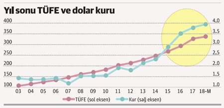 Tüketici fiyat endeksi ile dolar kurunun yıl sonu düzeylerini aynı grafikte bir araya getirdik. Halen kullanılmakta olan TÜFE 2003 bazlı olduğu için o yıla kadar geri gittik. Grafikte dikkatimizi çeken bir durum var.