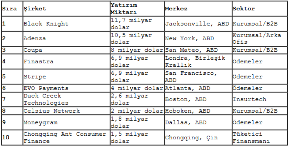 Fintech yatırımları küresel çapta geçen yılın ilk ve ikinci yarısı arasında ise hafif bir artış gösterdi. Yılın ilk yarısında 55,5 milyar dolar olan yatırımlar ikinci yarıda 58,2 milyar dolara yükseldi. ABD merkezli Black Knight'ın Intercontinental Exchange tarafından 11,7 milyar dolara satın alınması, ABD merkezli Adenza'nın Nasdaq tarafından 10,5 milyar dolara satın alınması, İngiltere merkezli Finastra'nın 6,9 milyar dolarlık özel sermaye artırımı, ABD merkezli Avantax'ın Cetera tarafından 1,2 milyar dolara satın alınması, Kaliforniya merkezli Generate'in 1 milyar dolarlık girişim sermayesi artırımı ve Brezilya merkezli Pismo'nun Visa tarafından 1 milyar dolara satın alınması dâhil olmak üzere yılın ikinci yarısında bir milyar doların üzerinde altı anlaşma gerçekleşti.