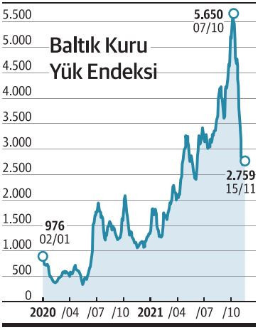 Hilal Sarı'nın Dünya'daki haberine göre şirketler, yatırımcılar ve politika yapıcılar liman sıkışmaları, navlun bedelleri, çip darboğazı, enerji krizi gibi sorunlarla boğuşmaya devam ediyor olsa da küresel ticaretin önemli barometrelerinden biri olarak kabul edilen Baltık Kuru Yük Endeksi ekimde 2008’den bu yana en yüksek düzeyi gördükten sonra sadece bir ay içinde yüzde 50’nin üzerinde düşüş kaydetti. 7 Ekim itibariyle 5.650 düzeyi ile 13 yılın zirvesini gören kuru yük endeksi, 5 Kasım itibariyle 2.715 düzeyine kadar geriledi. Endeks 15 Kasım itibariyle 2759 düzeyinde.