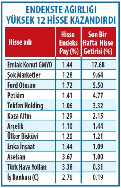 Endekste ağırlığı yüksek hisse senetlerinde alımların gelmesi borsanın güçlü destek seviyelerinde tutunmasına imkan sağladı. Endekste yüzde birin üzerinde ağırlığı olan 29 hisse senedinden 12’si haftayı yükselerek tamamlarken 17’si düştü. Ağırlıklı olarak satış gözükse de bunların marjlarının çok güçlü olmadığı gözleniyor. Bu hisseler içerisinde Emlak Konut GMYO, Şok Marketler, Ford Otosan, Petkim’in yüzde 4’ün üzerinde değer kazanması endekse olumlu yansıdı. 12 hissenin hareketi borsayı güçlü tuttu.