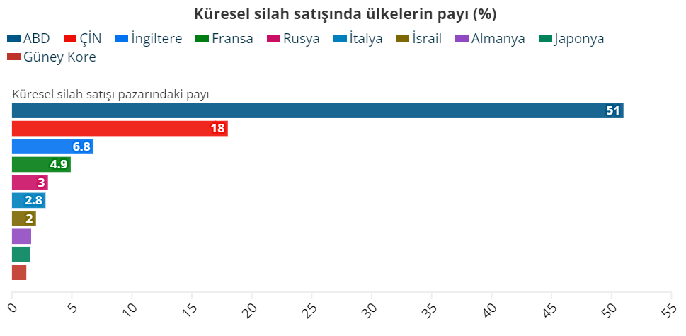 Küresel savunma sektöründeki en büyük 100 şirket içindeki ABD'li toplam 40 şirket, 2021'de 299 milyar dolarlık silah satışı yaparak, reel olarak bir önceki yıla göre yüzde 0,8 artışla tüm satışların yüzde 51'ini karşıladı.