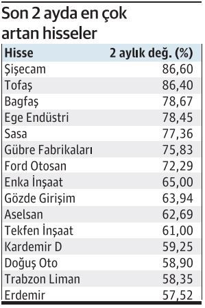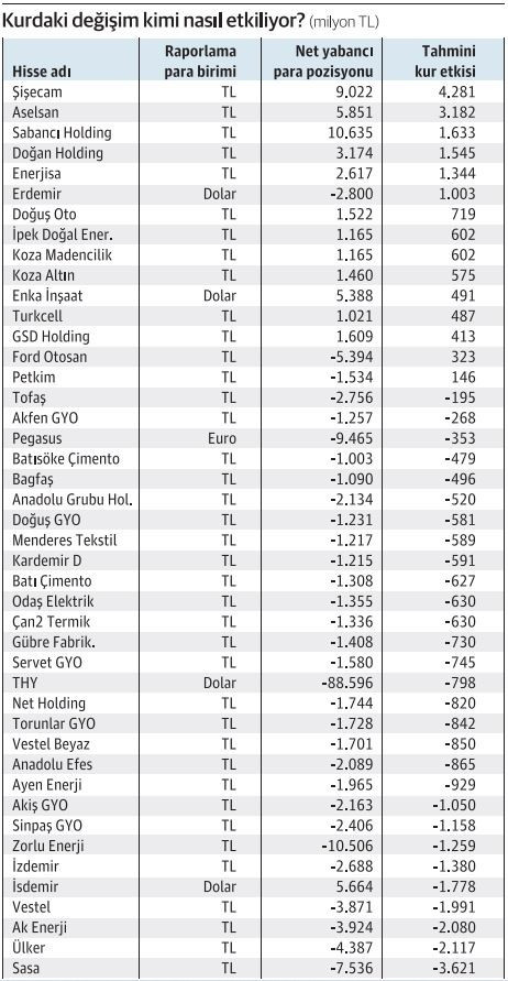 Ziraat Yatırım, mevcut durumda şirketlerin eylül ayı sonundaki döviz pozisyonlarını koruduklarını ve kurların da 13.70 TL seviyelerinde kaldığını varsayarak, kurlardaki artışın olası mali etkilerini hesapladı. Kurlardaki değişime bağlı olarak Şişe Cam 4.3 milyar TL, Aselsan 3.2 milyar TL, Sabancı Holding 1.6 milyar TL ve Doğan Holding 1.5 milyar TL kur farkı geliri yazarak döviz kurlarındaki değişimden olumlu etkilenebilecek şirketler olarak ön plana çıkabilir. Diğer taraftan yüksek fazla pozisyonu olmasına karşın fi nansallarını dolar cinsinden tutan İskenderun Demir Çelik, TL ve Euro fazla pozisyonları nedeniyle 1.7 milyar TL’lik bir kur farkı gideri yazabilir. Sasa Polyester 3.6 milyar TL, Ülker Bisküvi 2.1 milyar TL, Ak Enerji 2 milyar TL, Vestel 1.9 milyar TL ve İzmir Demir Çelik 1.3 milyar TL kur farkı gideri yazarak söz konusu kur artışlarından olumsuz etkilenebilecek şirketler olarak ön plana çıkıyor. Yüksek döviz açık pozisyonu olmasına karşın fi nansallarını dolar cinsinden tutan Türk Hava Yolları, TL fazlasından dolayı 798 milyon TL kur farkı gideri yazabilir. Ek olarak Ereğli Demir Çelik açık pozisyonu yüksek olmakla birlikte dolar cinsinden bilanço tutması ve açık pozisyonlarının ağırlıklı TL cinsinden olması nedeniyle 1 milyar TL kur farkı geliri yazabileceği hesaplanıyor.