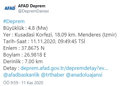Afet ve Acil Durum Yönetimi Başkanlığı'nın (AFAD), Ege Denizi Kuşadası açıklarında saat 09.49'da 4,8 büyüklüğünde bir deprem meydana geldiğini bildirdi.