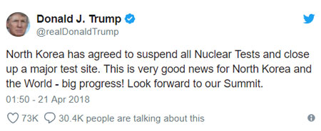 ABD Başkanı Donald Trump Twitter hesabından yaptığı açıklamada, “Kuzey Kore tüm nükleer testleri askıya almayı ve ana tesislerinden birini kapatmayı kabul etti. Bu Kuzey Kore ve dünya için çok güzel bir haber –büyük ilerleme! Yapacağımız zirveyi dört gözle bekliyorum” ifadelerini kullandı.