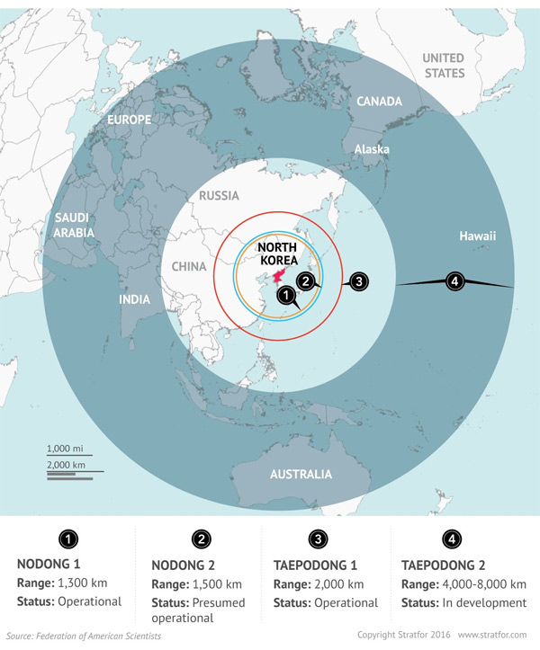 Amerikan özel istihbarat kuruluşu Stratfor, Kuzey Kore'nin fırlattığı füzelerin hangi ülkeleri tehdit ettiğini gösteren yeni bir harita yayınladı. Gölge CIA olarak bilinen Stratfor'un haritasına göre, 8 bin kilometre menzili bulunan Taepodong 2 füzesi Türkiye, Almanya, İngiltere ile birlikte ABD'nin batı eyaletlerini de vurabilir. Füze henüz tamamlanmadı, Kuzey Koreli mühendisler proje üstünde çalışıyor.