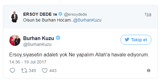 AK Parti milletvekili Burhan Kuzu, kendisine Twitter'dan kendisine gelen "Olsun be Burhan Hocam" şeklindeki mesaja "Ersoy, siyasetin adaleti yok. Ne yapalım Allah'a havale ediyorum'' yanıtını verdi.